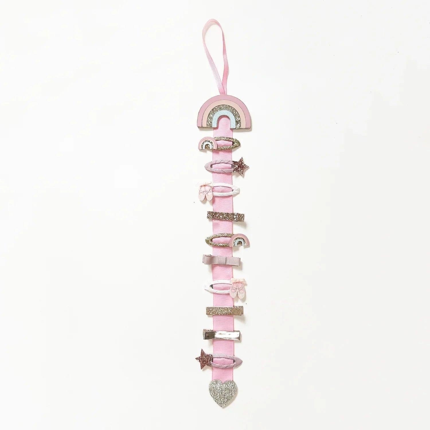 Our rainbow clip hanger can fit around 12 clips (depending on clip size) and hangs perfectly on a grosgrain ribbon!