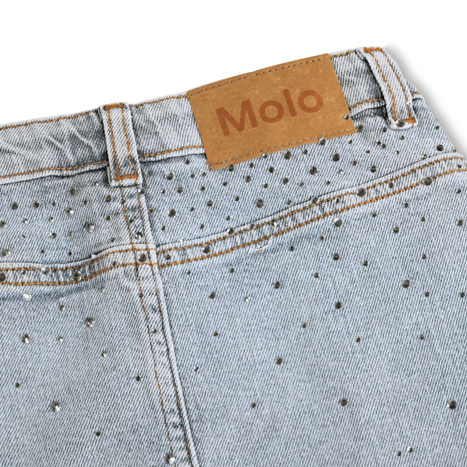 Denim skirt adorned with rhinestones embellishments and buttons for fastening. The skirt reaches mid-thigh and has a waist with belt loops and front pockets. The stylish cut includes detailed stitching that runs from the pockets down.