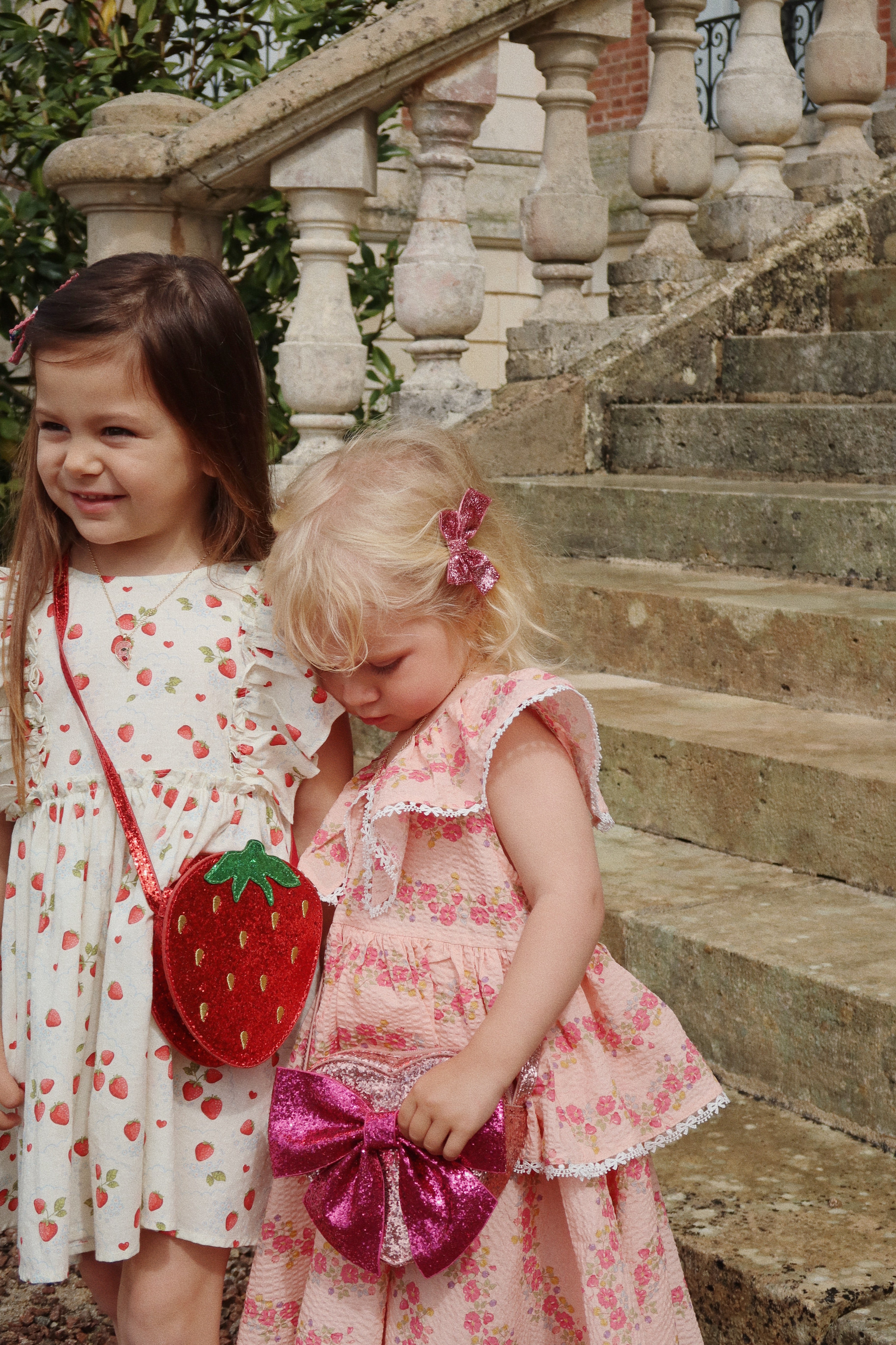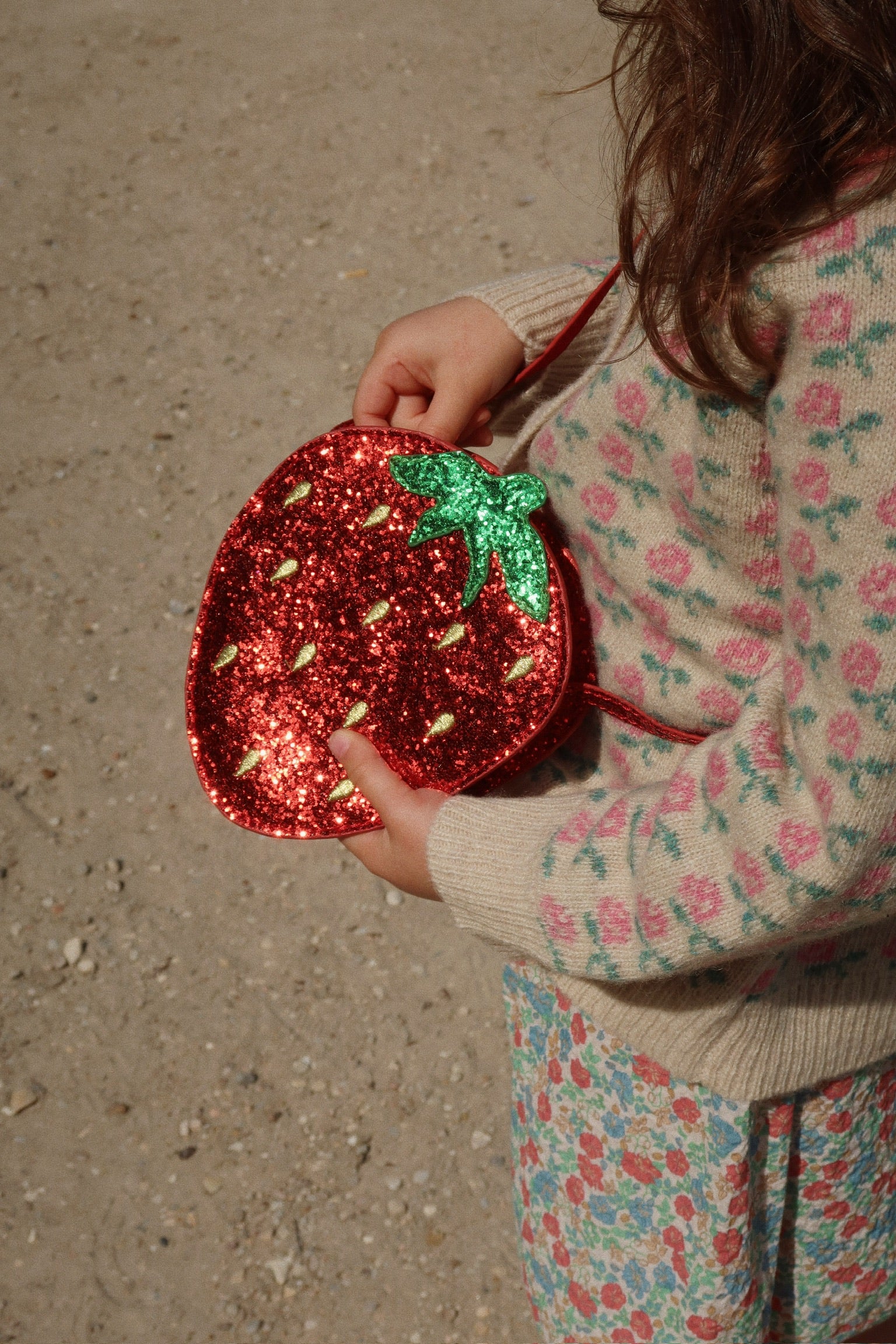 Cute shoulder bag designed like a delicious little strawberry that sparkles and shines wherever you go.
