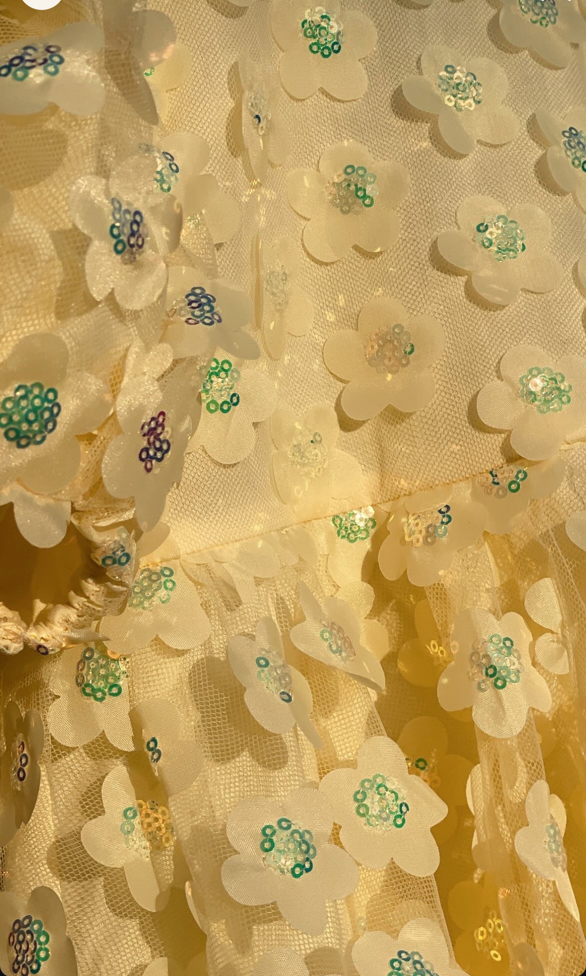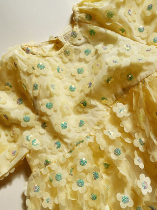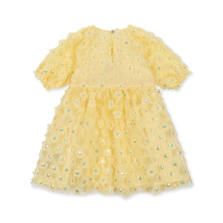 Adorable summer dress guaranteed to brighten up the day! Cotton dress with tulle adorned with flowers and sequins. Designed with puff sleeves and elasticated arm openings for comfort. Closes with a single mother of pearl button at the back neckline.