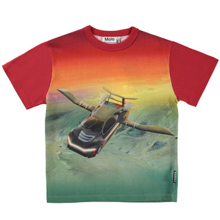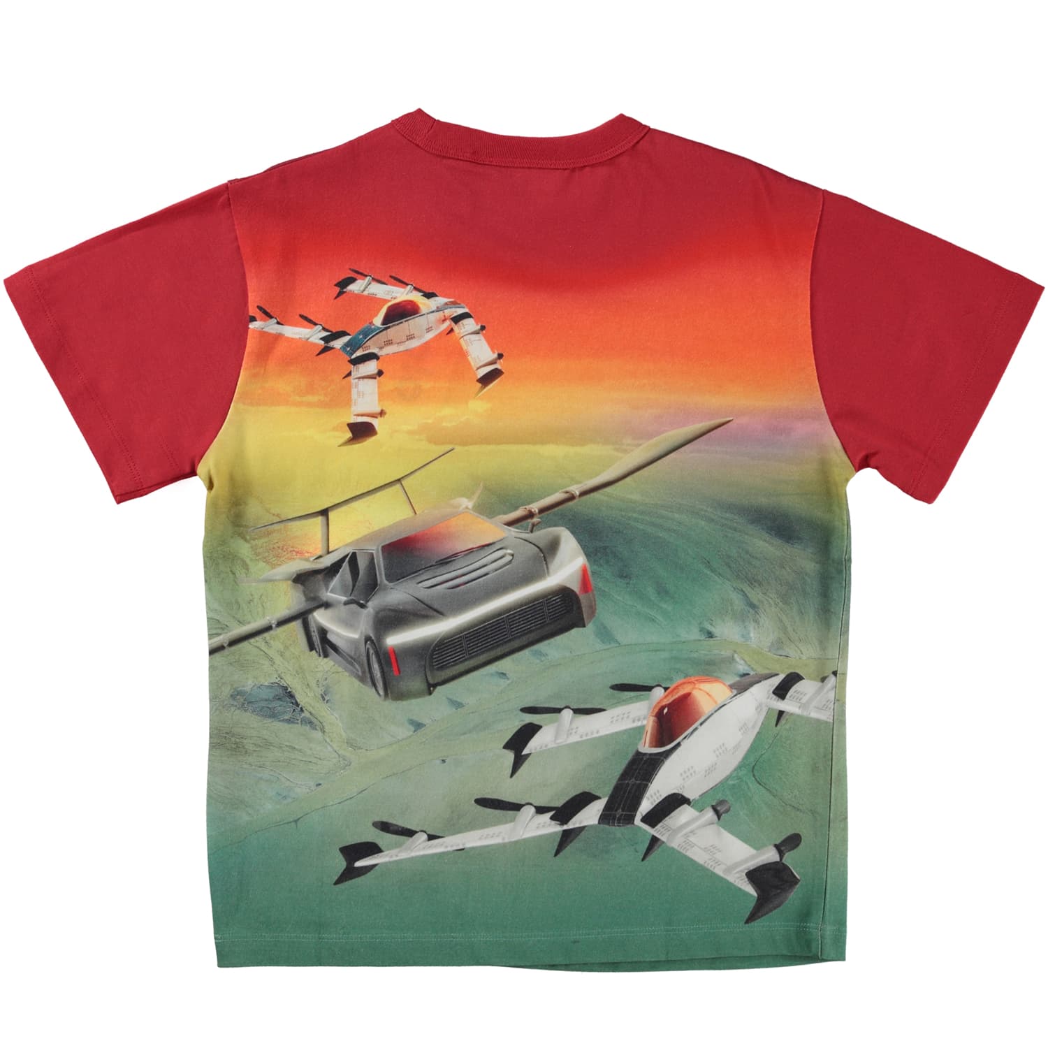 Cool Molo t-shirt in red with a print flying cars and the front and back.