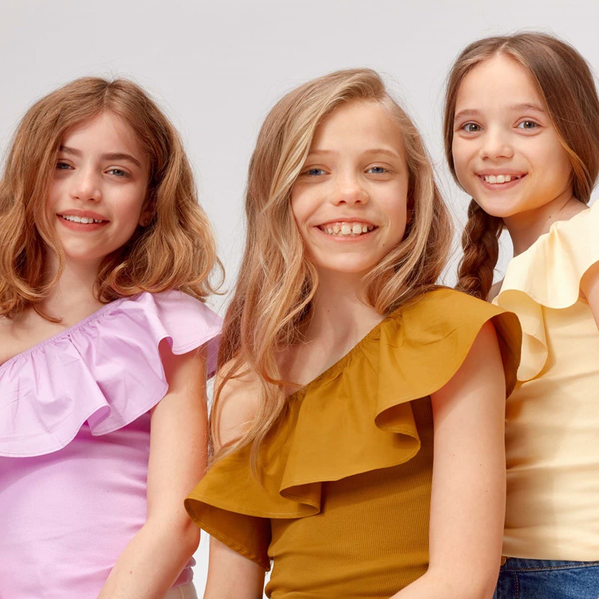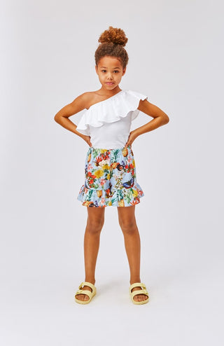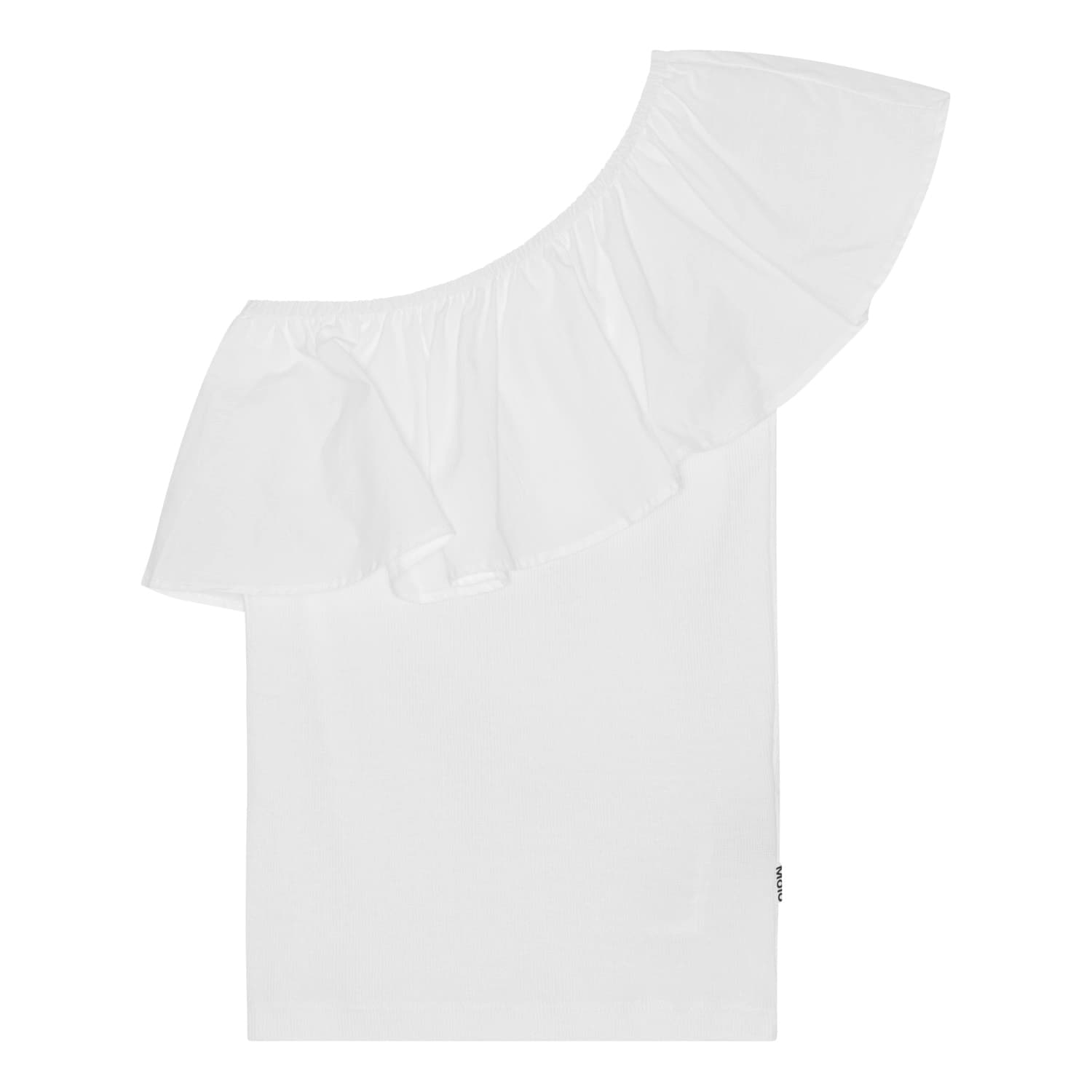 Rebecca is a top in organic cotton with one shoulder strap. The body of the top is in a stretchy material with a beautiful, large poplin ruffle across the front and back shoulder.