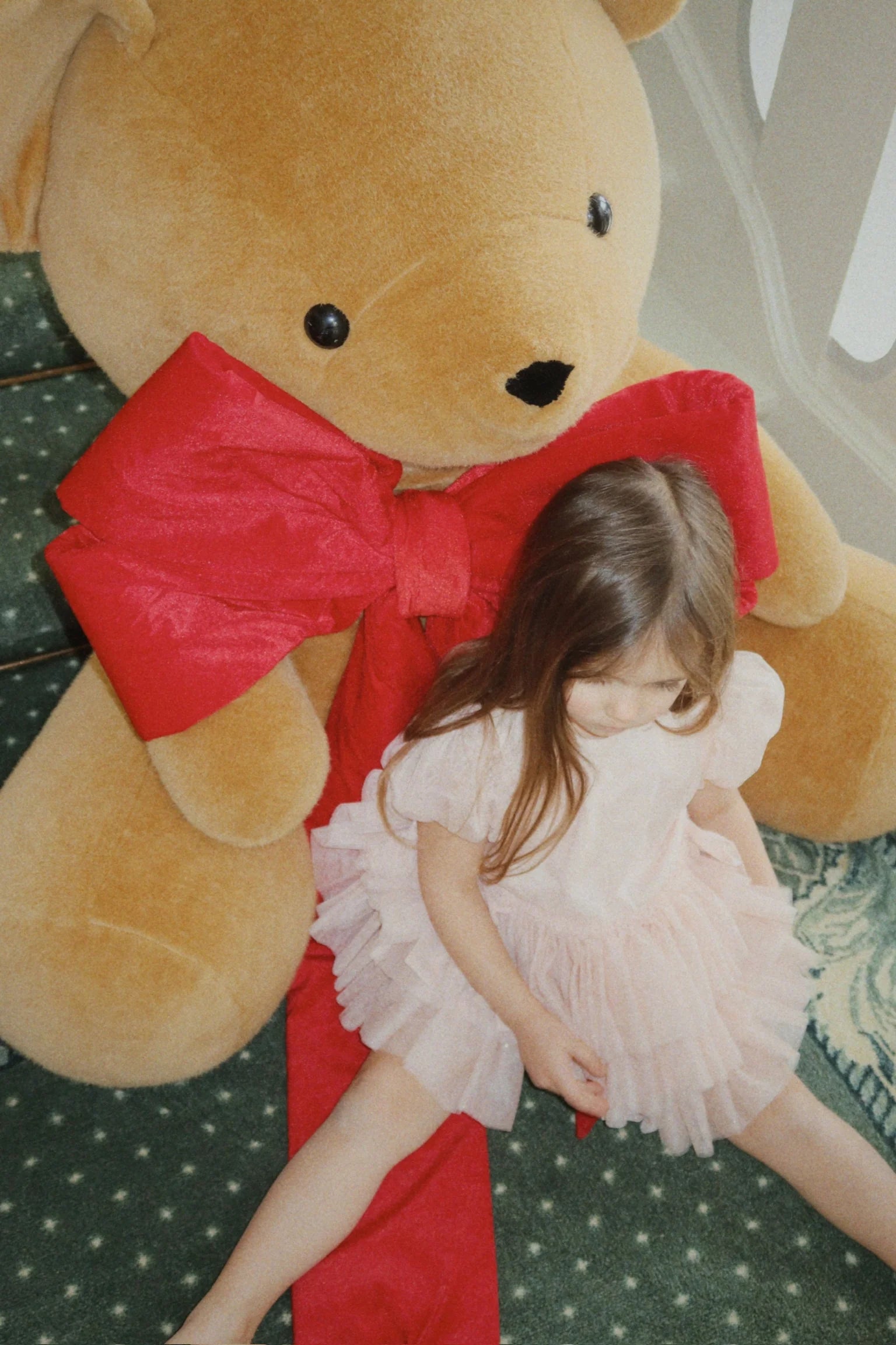 Festive tulle dress with elegant detailing. Designed with puffy sleeves and a full, layered skirt.