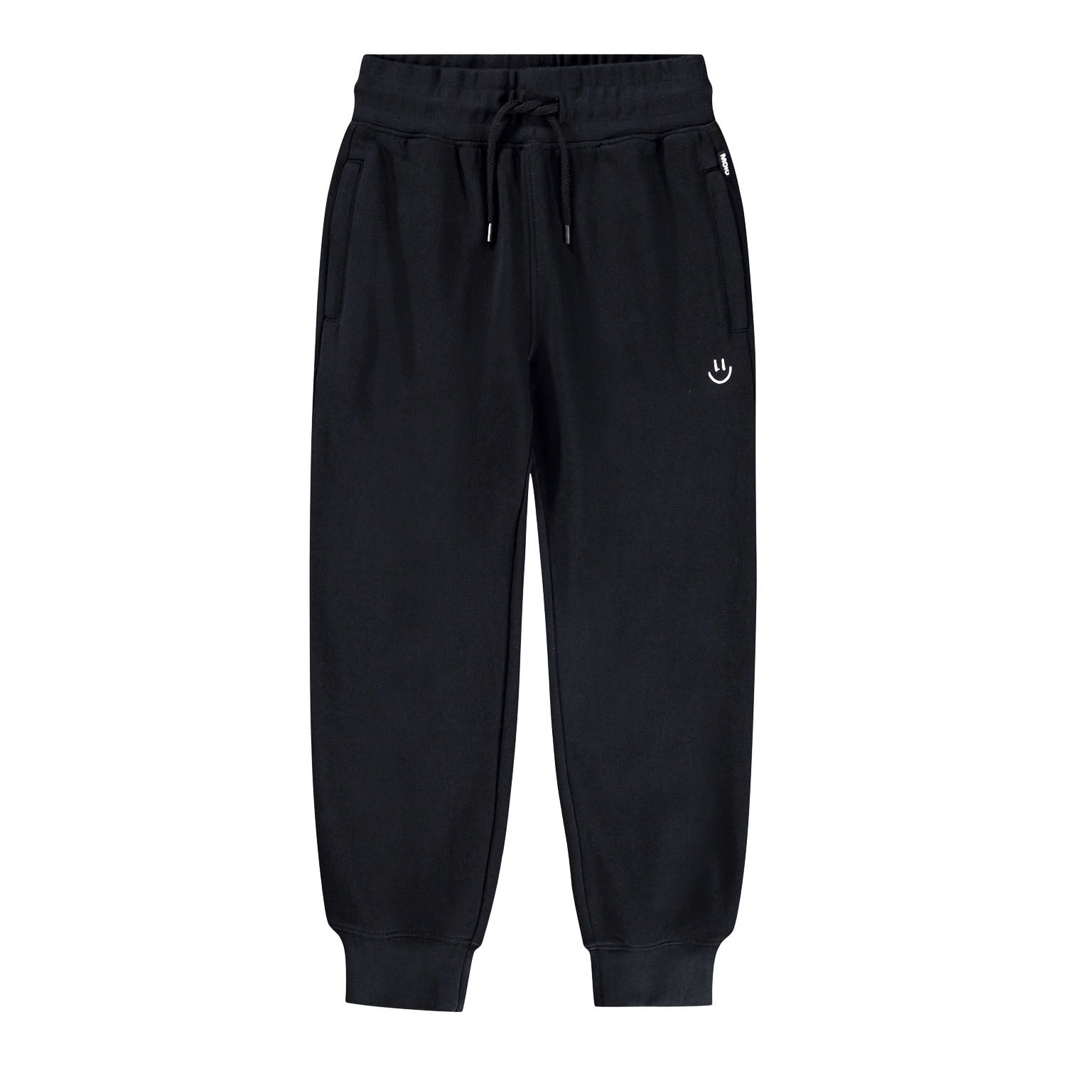 Sweatpants made of organic cotton with an elastic waist, inner drawstring, zip pockets and ribbed cuffs at the ankles. The sweatpants have a regular fit and a small embroidered face by the pocket. The brushed interior makes them soft and warm to wear.