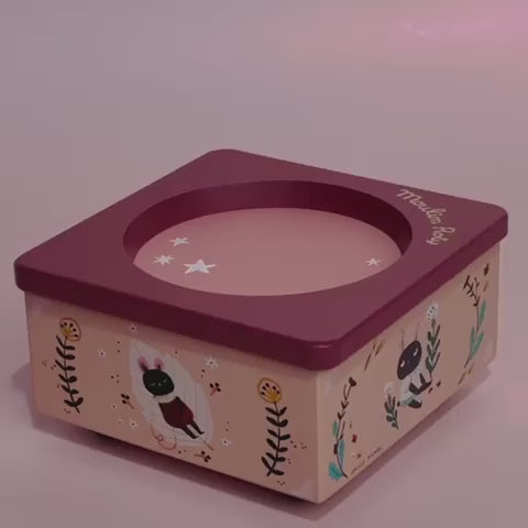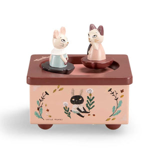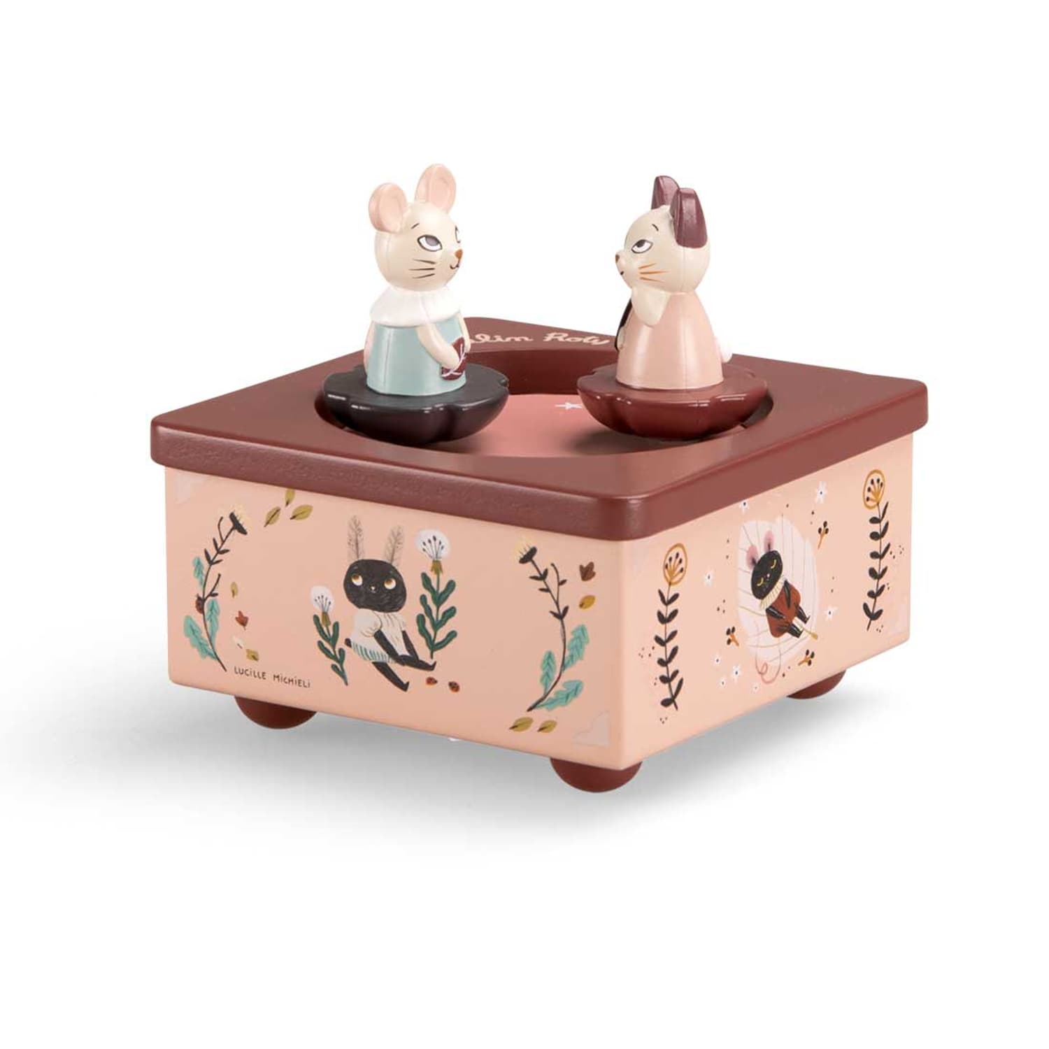 With its sweet and magical design, this rose-colored wooden musical box with its illustrations plays enchanting lullabies as the cat and mouse rotate and dance in harmony to the soothing music.