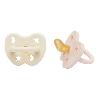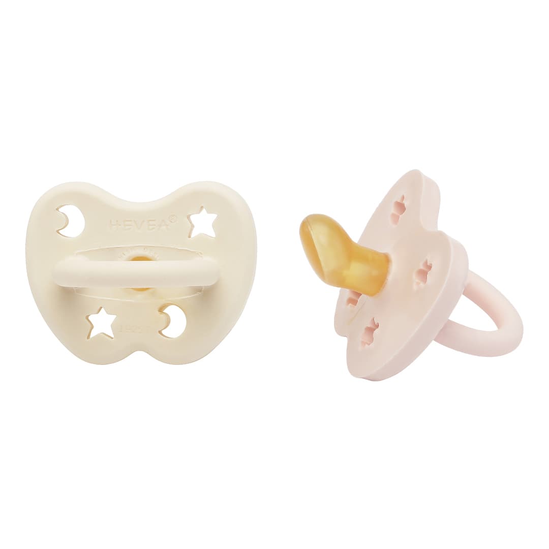 This two-pack of HEVEA® 100% Natural Rubber Pacifiers comes in several beautiful color choices perfect for newborns and babies 0+ months. HEVEA pacifiers feature a seamless one-piece build that makes them easy to clean and hygienic. The natural rubber teat and face ensure the pacifier is soft to touch and gentle on your baby's face and lips. And the fun cut out shapes on the face ensure your baby’s safety while also having some adorable fun!