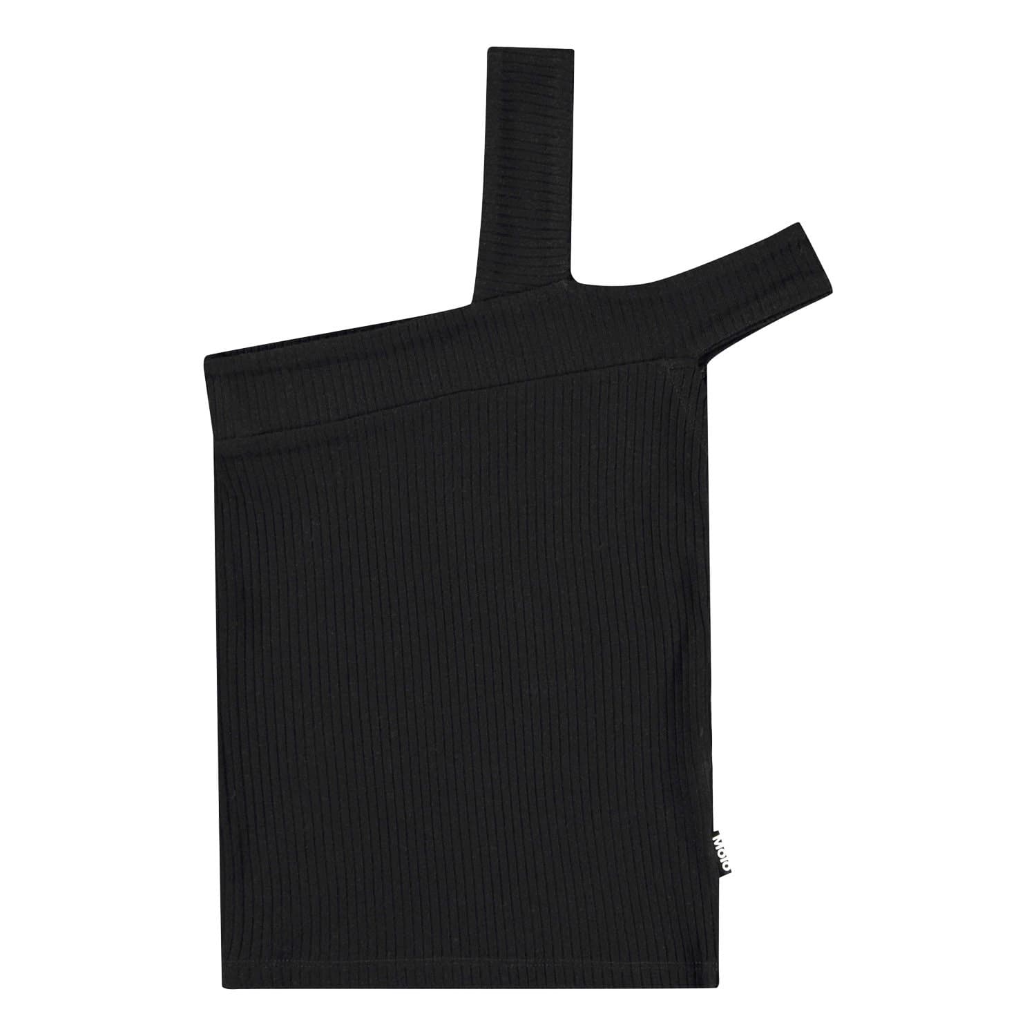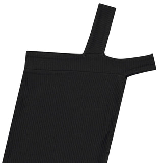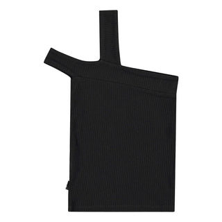 Fitted black top in stretchy soft viscose rib. The top has two straps on the left shoulder, one goes up over the shoulder while the other sits down over the shoulder.