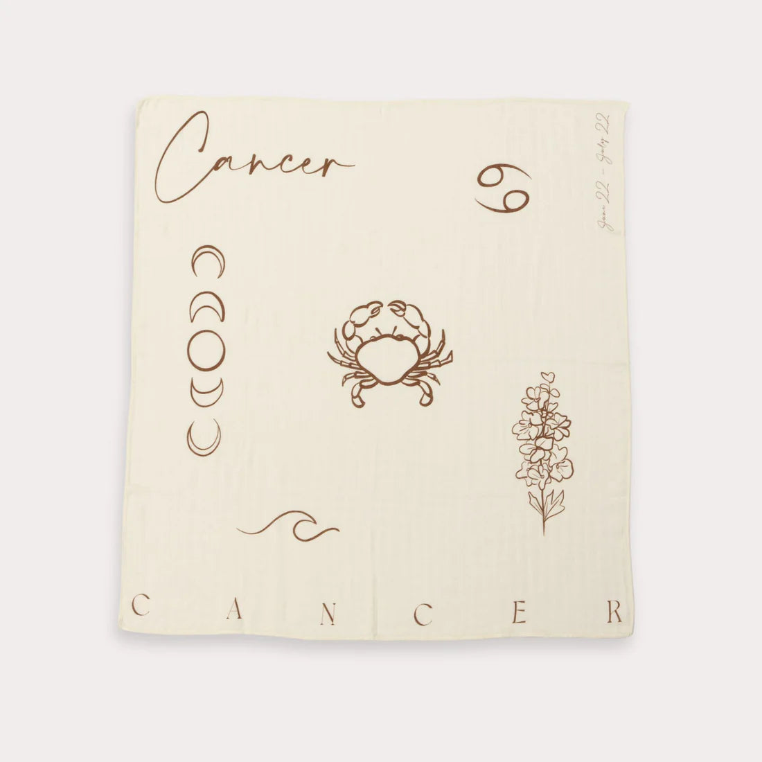 This swaddle features Cancer (Jun 21 - Jul 22): Intuitive and empathetic, Cancer brings emotional warmth and understanding. Choose your child's star sign and wrap them in the cosmic embrace of our Zodiac Muslin Swaddle Collection.